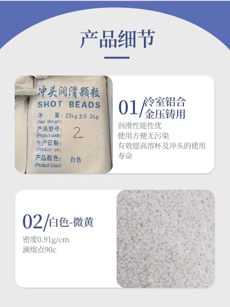 它分含石墨及不含石墨。产品的颗粒尺寸分为:¢1.0~1.5mm,¢1.5~2.0mm,¢2.0~3.0mm,它能在压射套筒和压射头顶部熔化并迅速扩展,通过其优越的毛细管效应在压射套筒内形成一个性能优异的润滑膜。它使用方便无需传统的油基或水基产品所用的滴涂泵式喷涂系统。