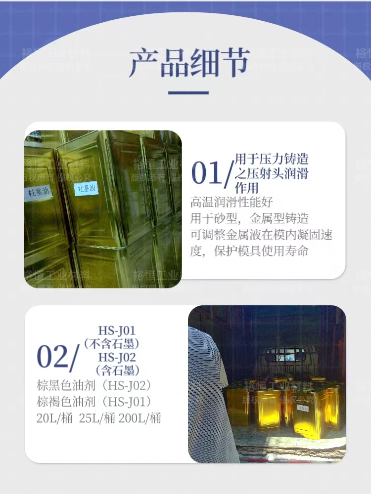 本系列产品是用于活塞的矿物质油基润滑剂。液态粘稠状剂,有加石墨的和不加石墨的。主要用于压力铸造之压射头的润滑作用。产品中含有特种极化剂、触变剂,具有极好的高温润滑性。用于砂型、金属型铸造,能使铸件与型容易分离,同时可调整金属液在模内的凝固速度,延长金属型模具的使用寿命。